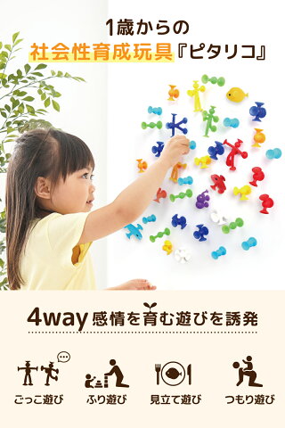 【創造力が刺激される新知育おもちゃ"PitaRico(ピタリコ)"】 1.床だけでなく壁も使い今までにない立体的な思考が身につく 2.興味をそそるカラフルな色合い 3.指先に心地よい刺激を与える吸盤のつける&はがす運動 4.見本を見てつくる真似学習に 5.自分だけのオリジナル作品をつくる自己表現力をつける 【PitaRico(ピタリコ)について】 ピタッとくっつく+利口=ピタリコが名前の由来です。