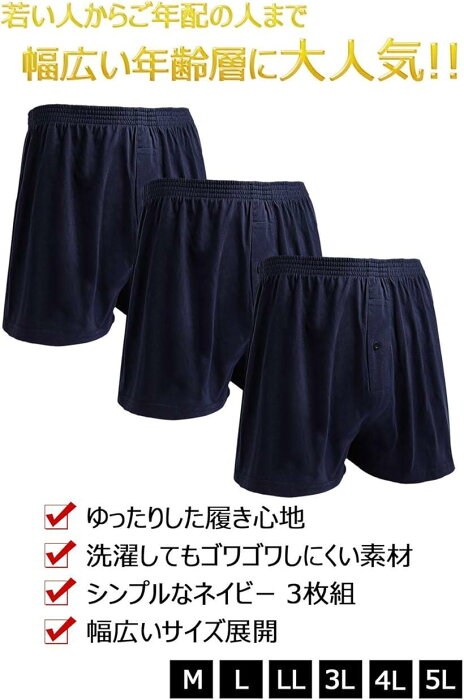 メンズ ニット トランクス 無地 3枚 セット 大きいサイズ 下着 吸水速乾 前開き ボタンあり(ネイビー3枚, 3L)