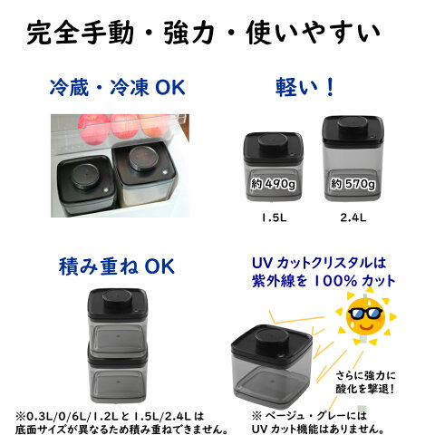 商品情報 サイズ・容量 (2.4L) 14.5cm×14.5cm×18.5cm(0.6L) 10.5cm×10.5cm×14.0cm 材質 (2.4L) フタ:PP樹脂、シリコンゴム 本体:PC樹脂(0.6L) フタ:ABS樹脂、シリコンゴム 本体:PC樹脂/ABS樹脂耐熱耐冷温度 −20度〜80度※電子レンジ使用不可※冷蔵・冷凍庫使用可能製造国 台湾メーカー保証 1年ご注意点 パッキンにホコリや毛、保存物のカスなどが付着すると真空を保ちにくくなります。
