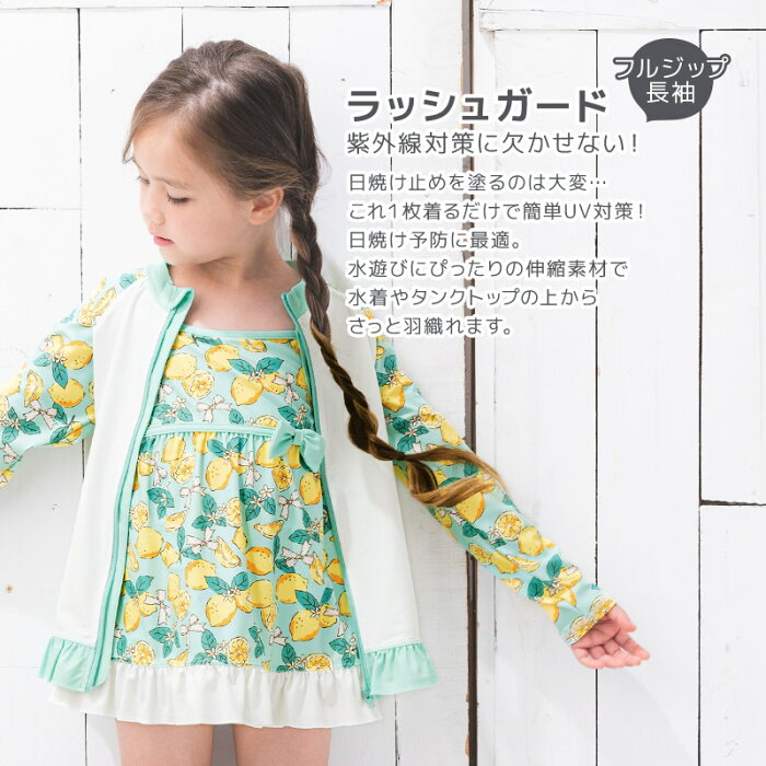 子供水着 長袖 ラッシュガード フルジップ UV加工 UPF50+(100-130cm)▽ キッズ スイムウェア UVカット フリル 女の子 可愛い かわいい プール 海水浴 夏 100cm 110cm 120cm 130cm▽ ポイント消化