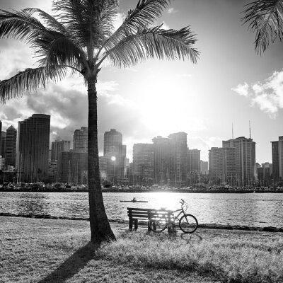 IGREBOW アイグレボウ|ハワイ 早朝のアラモアナビーチから見るワイキキの街 インテリアフォト ピクチャーアート 写真 スタイリッシュ モダン モノクローム モノクロ
